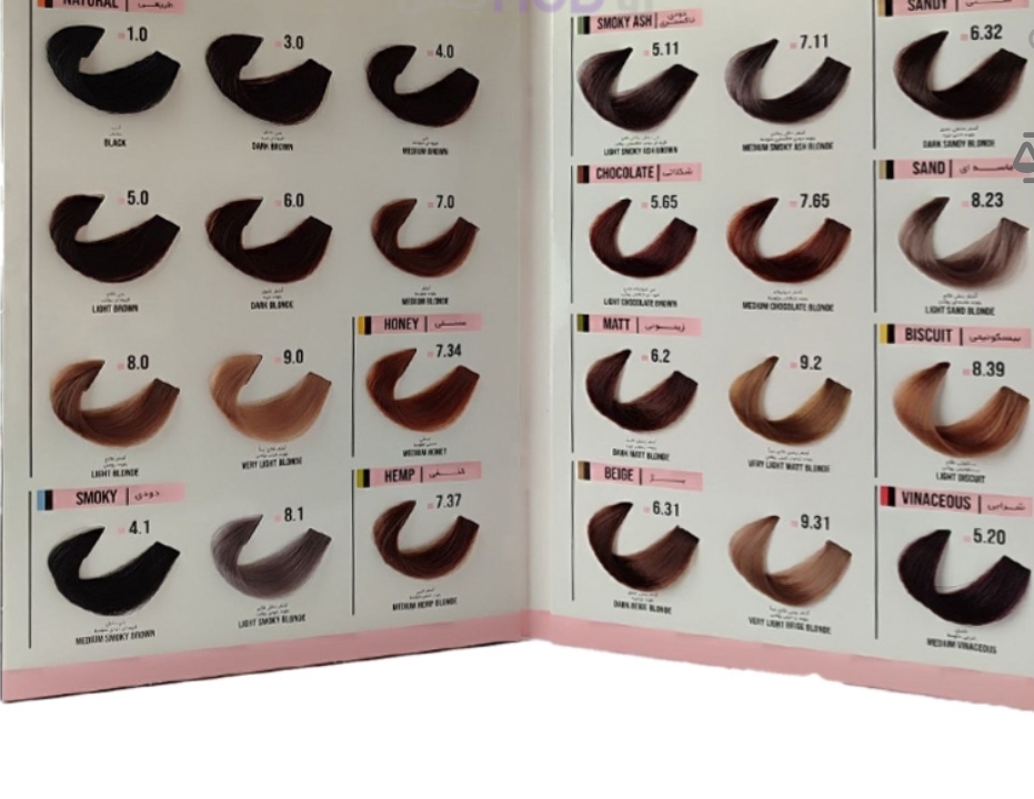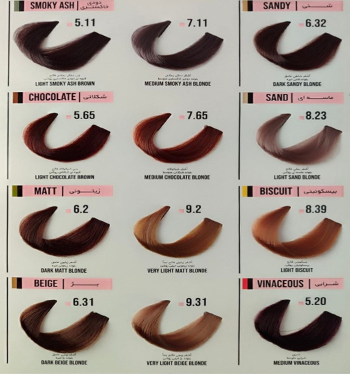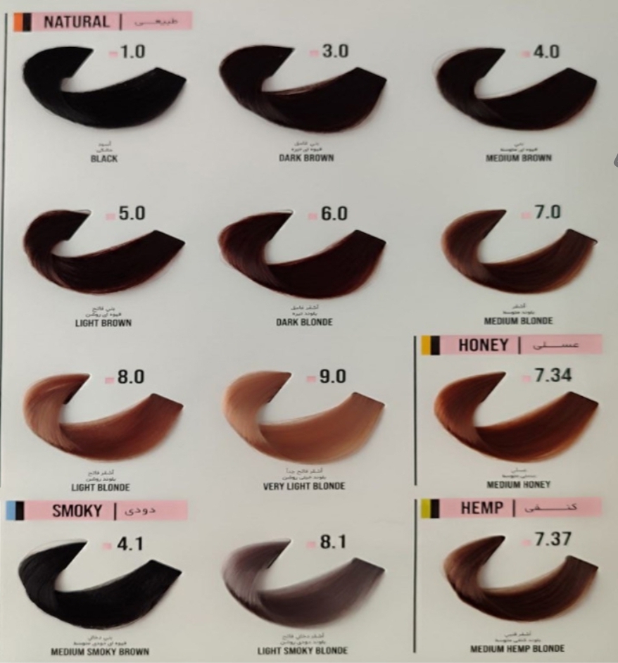 رنگ موهای فاقد سولفات، شامل رنگبندی گسترده ای نیستند. رنگ موی BARSEEL، شامل رنگهای شماره 1.0 مشکی، 3.0 قهوه ای تیره، 4.0 قهوه ای متوسط، 5.0 قهوه ای روشن، 6.0 بلوند تیره، 7.0 بلوند متوسط، 8.0 بلوند روشن 9.0 بلوند خیلی روشن، 7.34 عسلی متوسط، 7.37 کنفی، 4.1 قهوه ای دودی متوسط، 5.18.1 بلوند دودی روشن، 1 قهوه ای دودی خاکستری روشن، 7.11 یلوند دودی خاکستری متوسط، 6.32 بلوند شنی تیره، 5.65 قهوه ای شکلاتی روشن، 7.65 بلوند شکلاتی متوسط، 8.23 بلوند ماسه ای روشن، 6.2 بلوند زیتونی تیره، 9.2 بلوند زیتونی خیلی روشن، 8.39 بیسکوئیتی روشن، 6.31 بلوند بژ تیره، 9.31 بلوند بژ خیلی روشن و 5.20 شرابی متوسط میباشد که تمامی این مدلها یا به عباریت، سری کامل این رنگ مو، در رو مد باش با بهترین قیمت به فروش می رسد.
