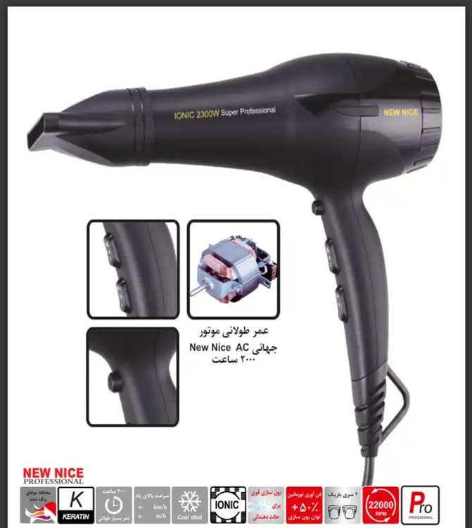 سشوار نیو نایس مدل NW-1050 یک سشوار حرفهای و پر قدرتِ 2300 وات است و نوع موتور آن AC است. این سشوار دارای شدت باد و حرارت بیشتری نسبت به سایر مدلهای سشوار بوده و برای کاربردهای حرفهای و آرایشگاهی مناسب است. سشوار نیو نایس مدل NW-1050 با تکنولوژی تولید یون که یک فناوری جدید در سشوارها است، با بکارگیری یک ژنراتور یونی و تولید یون منفی، فواید زیادی را برای مو ها به همراه دارد. استفاده کمتر از سشوار علاوه بر صرفهجویی در مصرف برق، باعث سالمتر ماندن موها میشود. این سشوار دارای دسته آرگونومیک برای ایجاد حداقل خستگی دست است. گفتنی است که دارای ۳ درجه تنظیمات دما و ۳ درجه تغییرات سرعت هوا است. سشوار نیو نایس مدل NW-1050دارای المنت تورمالین برای جلوگیری از ایجاد الکتریسیته ساکن در مو است. همچنین این سشوار حاوی ۲ سری باریک برای متمرکز کردن باد است و سیم آن ۳ متر است.